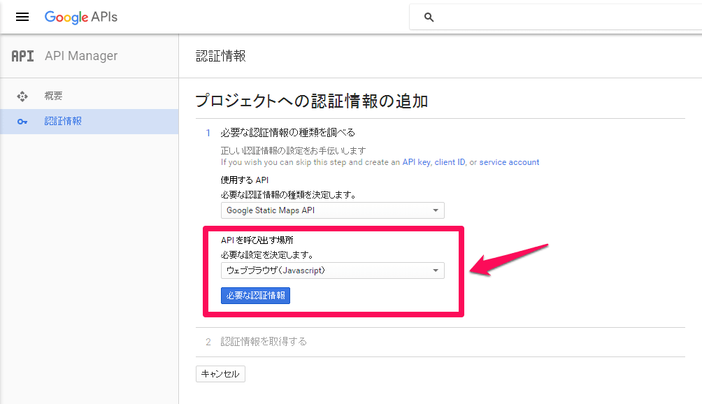 Webページ上で使用するので、「APIを呼び出す場所」には「ウェブブラウザ(Javascript)」を選択します。