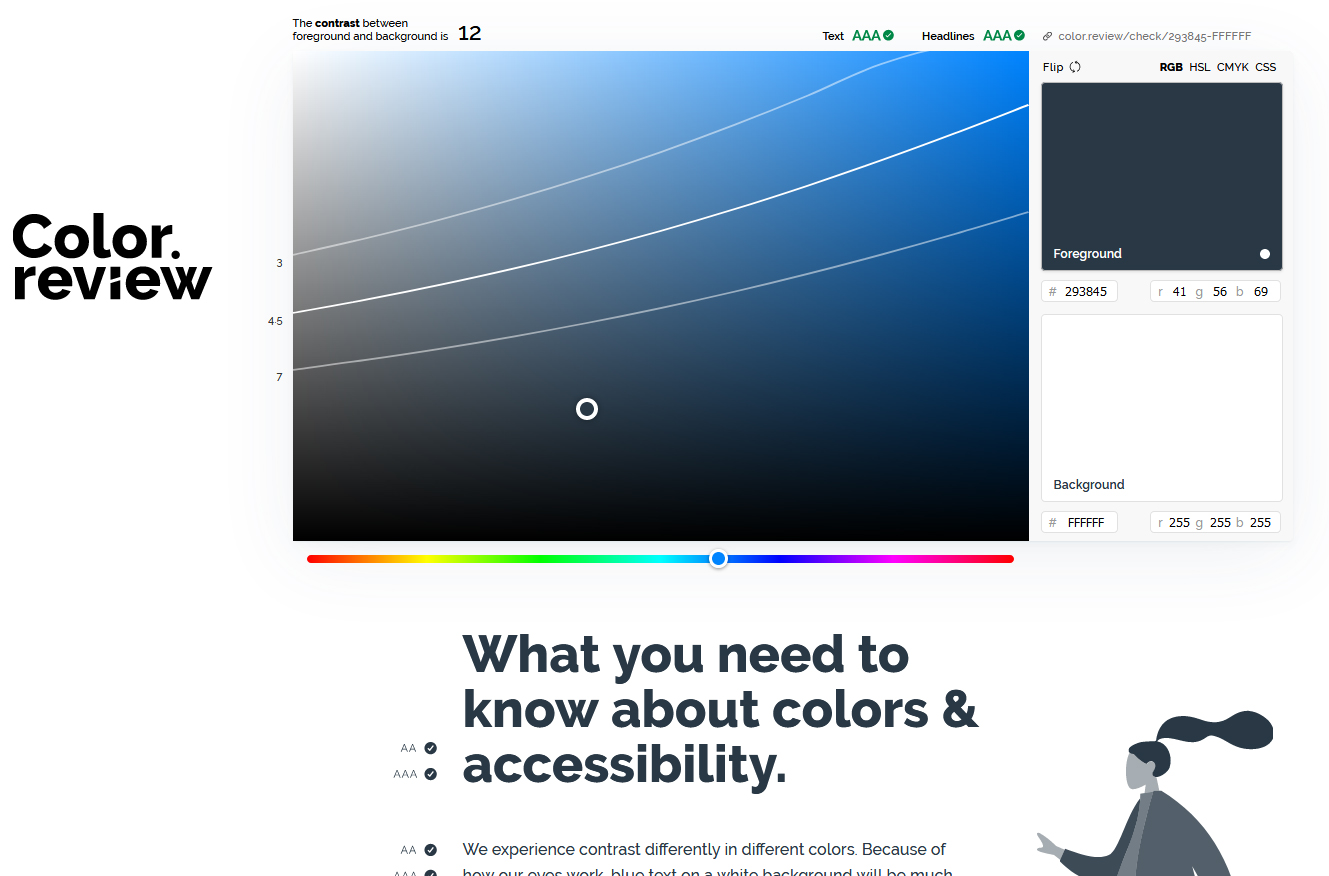 color.reviewの使い方は右パネルの前景、または背景をクリックし、ベースのカラーを設定します。あとは、スライダーでAAA、AAに収まるように調整するだけです。