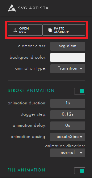 「OPEN SVG」から作成したSVGファイルをアップロードします。インラインSVGのコードの場合は「PASTE MARKUP」で貼り付けて下さい。