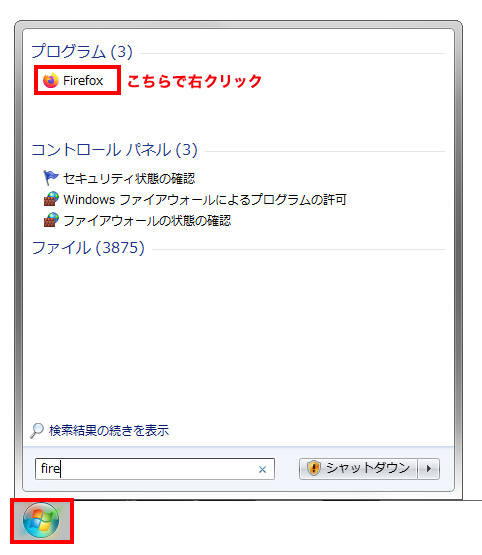 1.まず、スタートメニューよりFirefoxのプログラムを検索