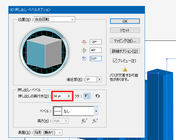 3D化の調整ウィンドウが出てきました。ここで、まずは右端にある「プレビュー」にチェックを入れましょう。私を含め、ほとんどの方は数値を操作するだけではどういう状態になっているのか分からないので、実際の図形を見ながら調整していきます。