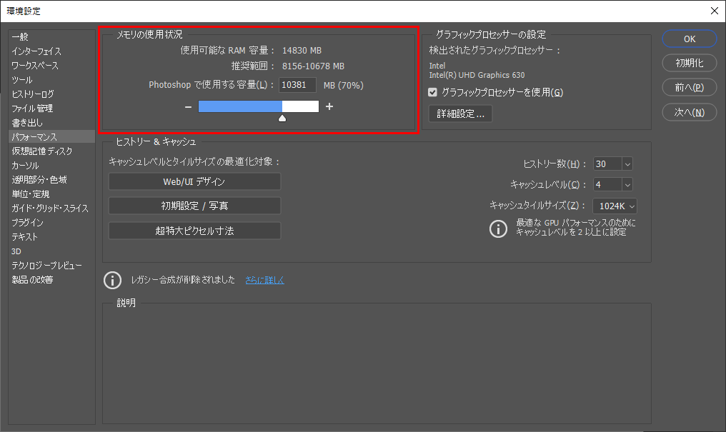 対処方法1と同じ設定画面で、Photoshopに割り当てるメモリの容量を増やし、動作を軽くすることができます。