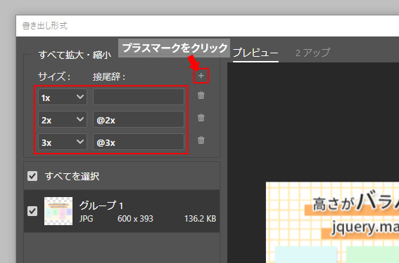 色々なサイズの画像をまとめて書き出すには、書き出し形式ウインドウにて【プラスマーク】をクリックします。