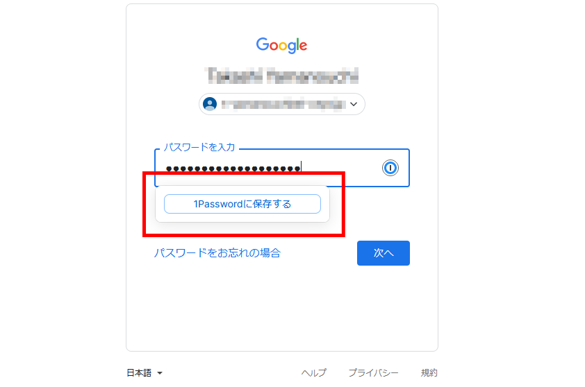 「メールアドレス」を入力し、「パスワード」を入力する際に、入力エリアの下に表示される《1Passwordに保存する》を押すと、1Passwordにログイン情報が保存されます。