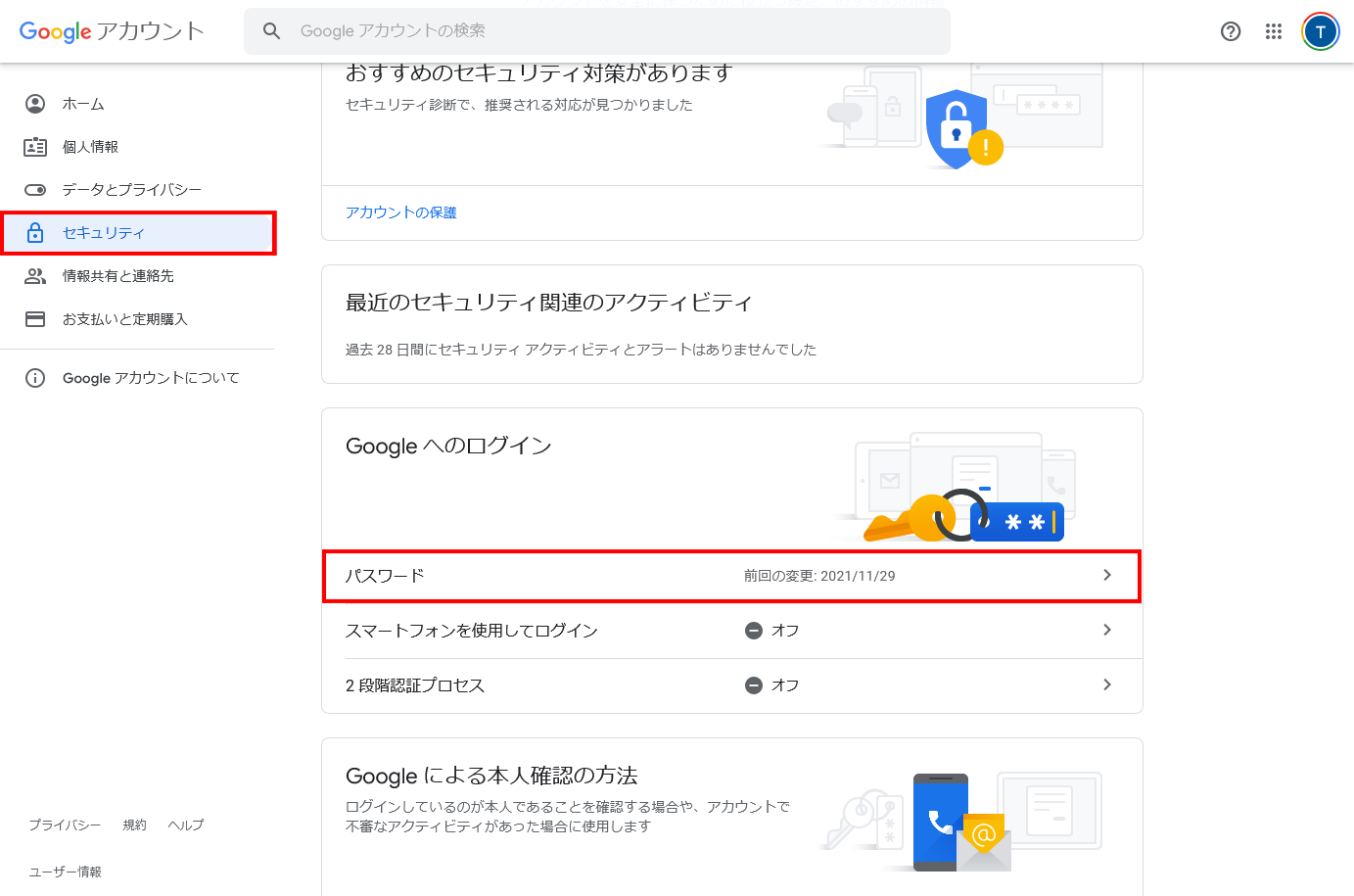左メニューの「セキュリティ」し、次に「パスワード」をクリックします。