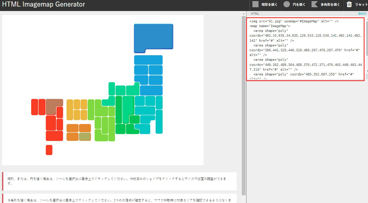 あとはコードをコピーしてhtmlに貼り付ければ、クリッカブルマップの完成です。