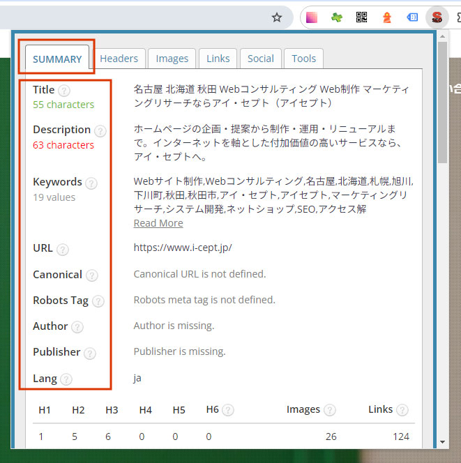 1つ目のタブ【SUMMARY】でチェックできるのは主に以下の9項目と、見出し、画像、リンク数です。