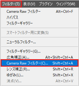 複製したレイヤーを選択した状態で、「フィルター → Camera Raw フィルター」を選択します。