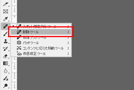 ツールバーの[スポット修復ブラシツール]のアイコンを長押しして、リストから[削除ツール]を選択します。