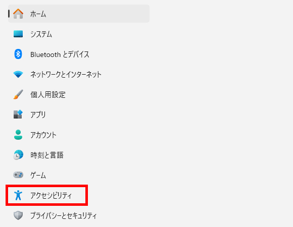 まずは設定画面を開きます。左メニューから「アクセシビリティ」をクリックします。