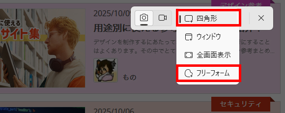 画面全体を撮りたい時は「ウィンドウ」または「全画面」を選択してください。