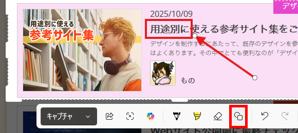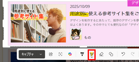 そのまま左端の「キャプチャ」をクリックすると蛍光ペンの線が引かれた状態の画面をコピーできますし、「保存先」を選択すると好きなフォルダに画像として保存することができます。